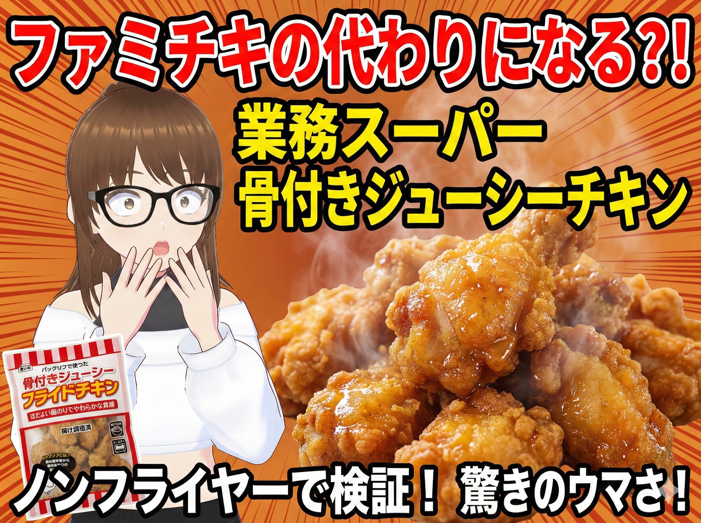 今回はおっさんが業務スーパーで見つけた「骨付きジューシーフライドチキン」に挑戦!バックリブ(鶏の肩甲骨から背中あたりの部位)を使った、ほどよい脂のりとやわらかな食感が売りの冷凍フライドチキンです。揚げ調理済みだからノンフライヤーで手軽に仕上がるよ!…って、おっさんがちゃんと美味しく作れるのかな?😂