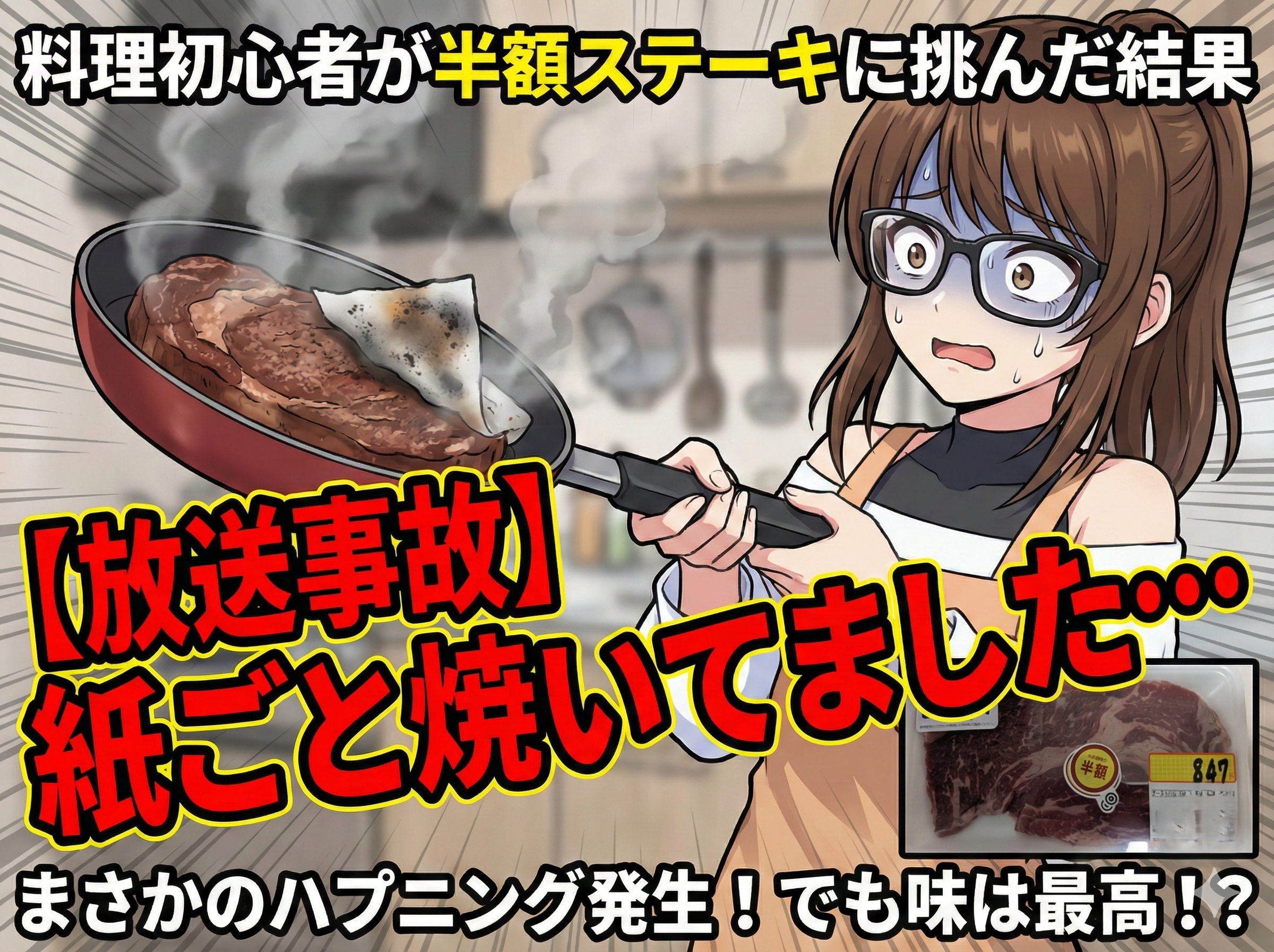 今回は、スーパーで見つけてテンションが上がった「半額ステーキ」に、普段あまり料理をしないおっさんが挑戦します!
