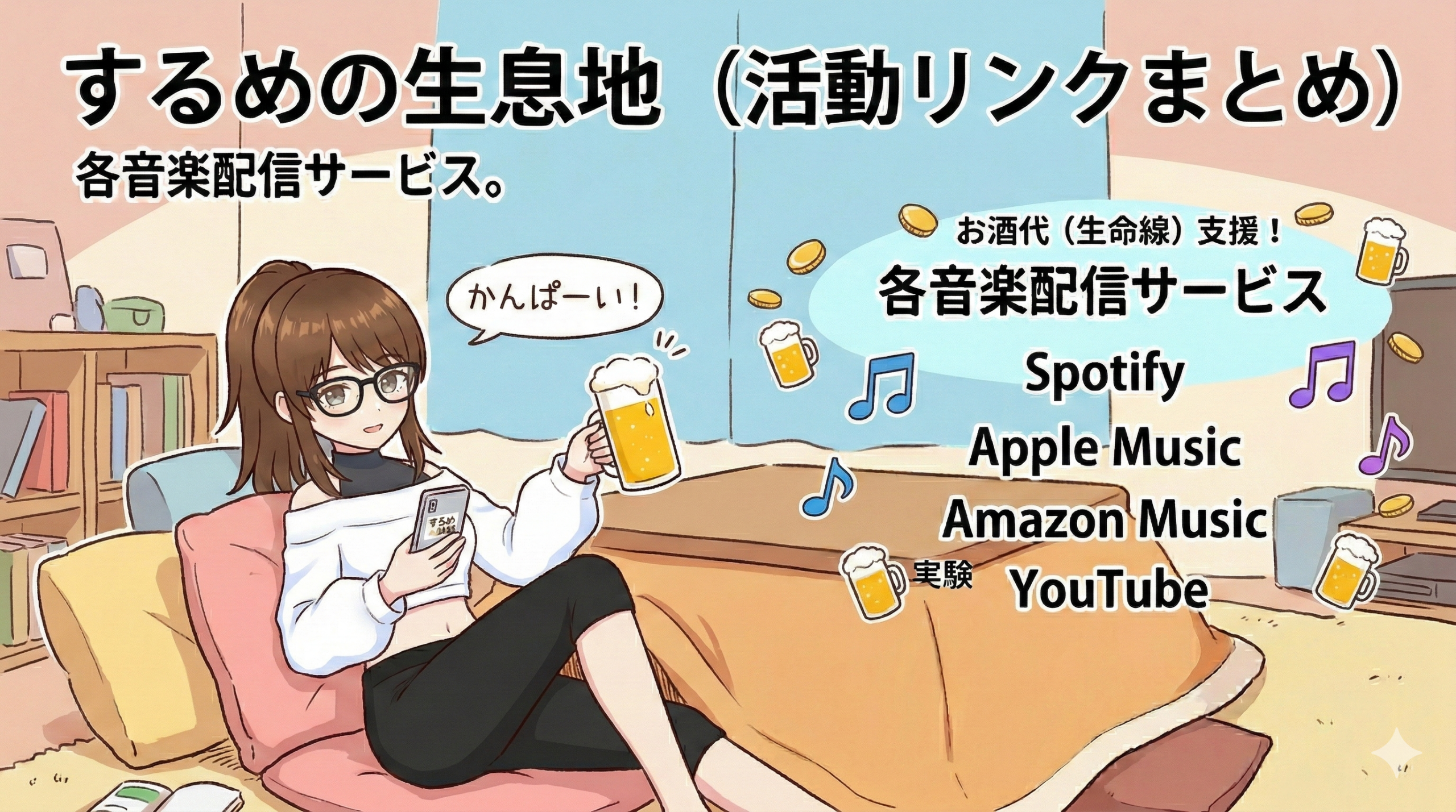 私の曲を配信しているところです!各プラットフォームで1曲ずつ単品で買うこともできるんですけど、ぶっちゃけサブスクの聴き放題で流しっぱなしにしてくれるのが一番気楽でコスパ良いですぇ。